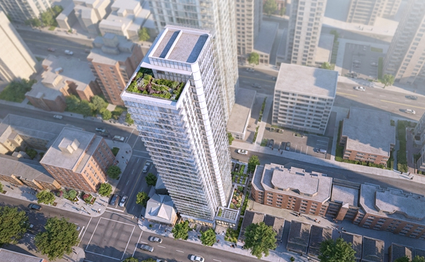Embracing a “tower-in-the-park” concept, setbacks beyond the tower footprint allow the building to meet the ground cleanly. Transparent lobby glazing and a landscaped urban forest reinforce openness and a visual connection to the public realm.