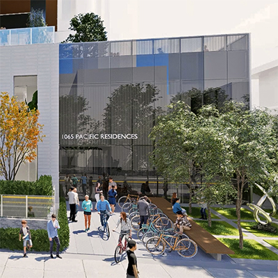 Along Pacific St, the design enhances the streetscape by lowering the entrance to street level, removing portions of the existing retaining wall, and introducing townhomes and layered planting that increase activity, privacy, and pedestrian engagement.