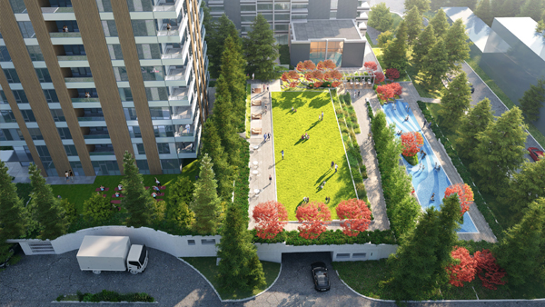 the existing 1970s 20-storey building to the east. The two towers are linked through a shared landscaped open space, enhancing livability and fostering community connections.